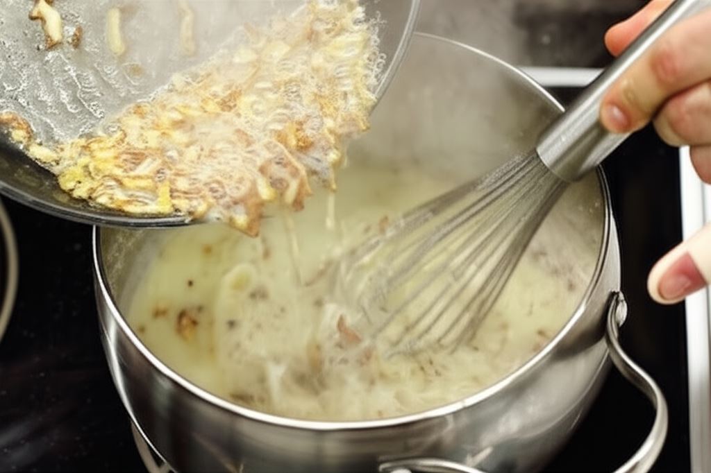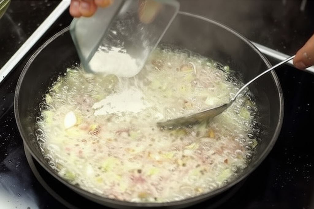 Cebulę i boczek podsmaż na patelni aż zbrązowieją, wsyp mąkę i starannie wymieszaj.