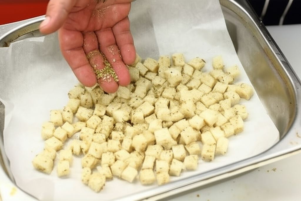 Odetnij skórki z chleba tostowego, a miękką część pokrój w małą kostkę. Skrop niewielką ilością oleju i wymieszaj z oregano, piecz w temperaturze 180 °C około 5 minut.