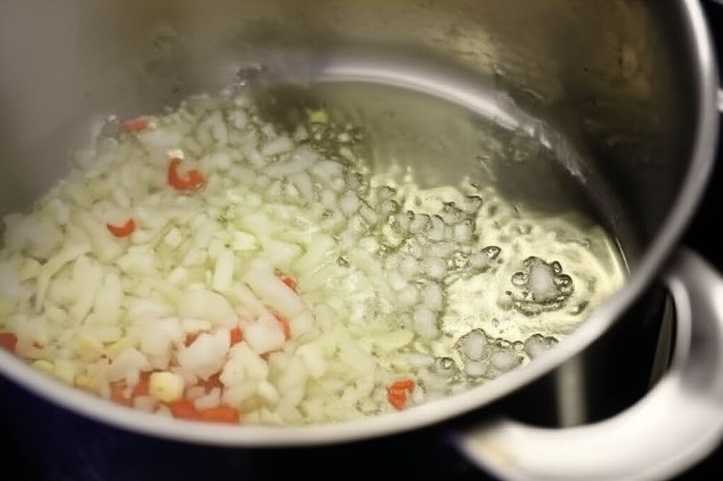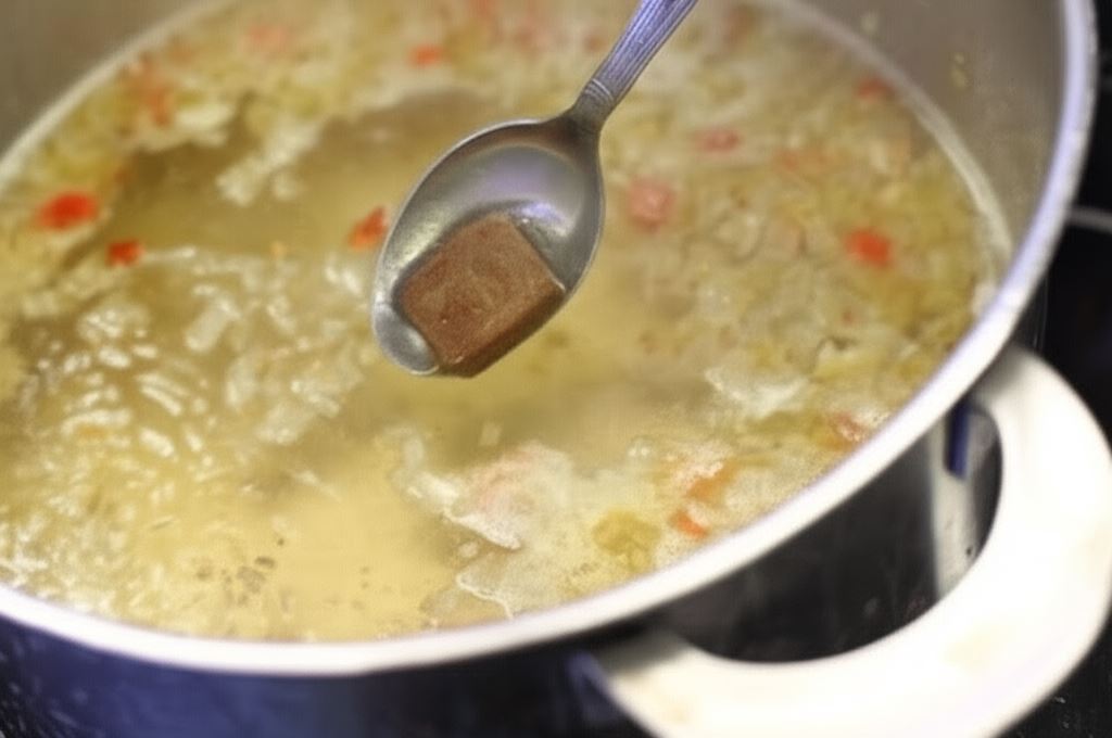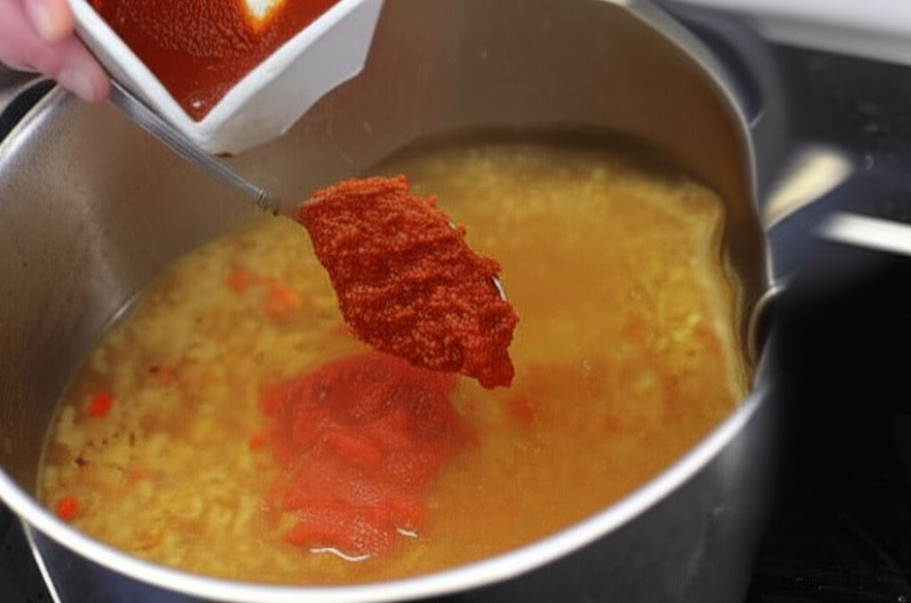 Gdy cebula stanie się rumiana dolej litr wody i wsyp kostkę Knorr.