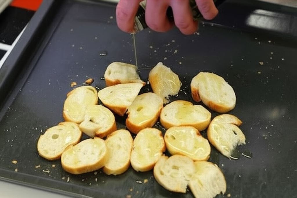 Bagietkę podziel na mniejsze części. Polej obficie resztą oliwy i umieść w piekarniku. Piecz w temperaturze 200 stopni, aż grzanki staną się rumiane.