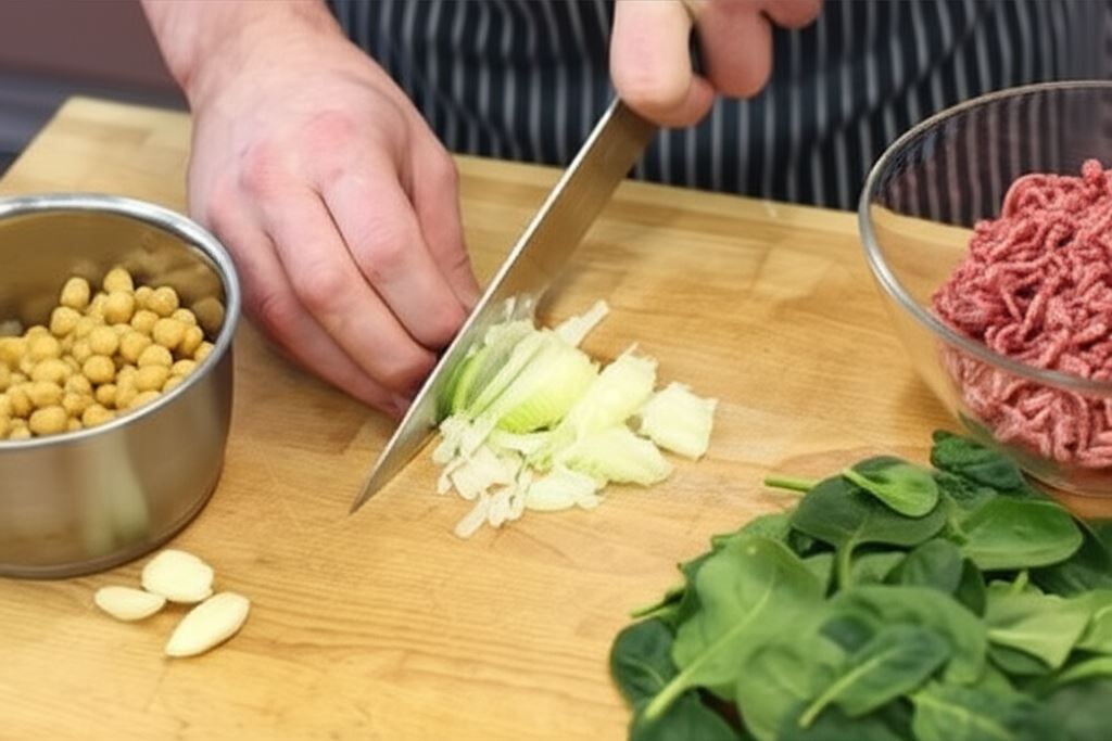 Ciecierzycę ugotuj aż zmięknie. Jagnięcinę zmiel w maszynce, czosnek posiekaj, cebulę pokrój na drobną kostkę, a szpinak na cienkie paseczki.