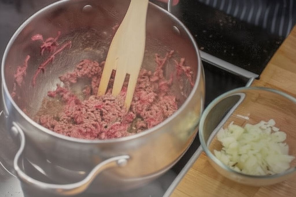 W garnku podgrzej oliwę i obsmaż mięso – smaż aż woda odparuje. Odłóż mięso na bok, po czym zrumień cebulę i czosnek.