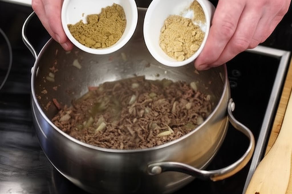 Wrzuć ponownie mięso, przyprawy Knorr – imbir oraz kmin rzymski i podsmaż moment wspólnie.
