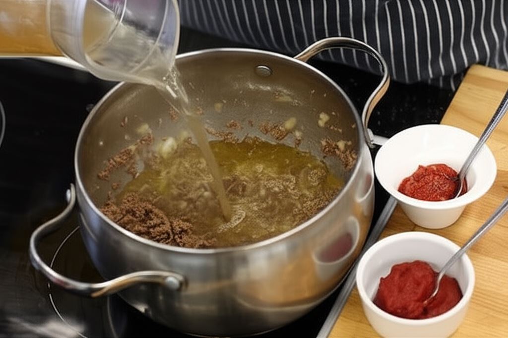 Potem wrzuć koncentrat pomidorowy i pastę Harrisa. Wszystko zalej litrem wody, dodaj kostki rosołowe, gotuj przez 15 minut.