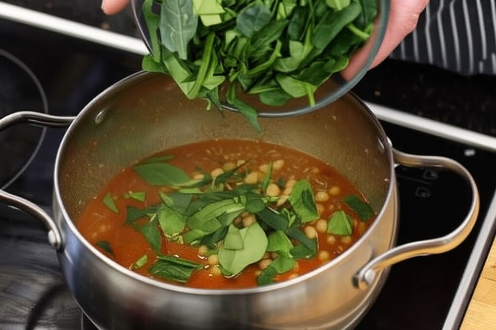 Po upływie tego czasu wsyp szpinak i ciecierzycę, a następnie gotuj przez kolejne 10 minut.