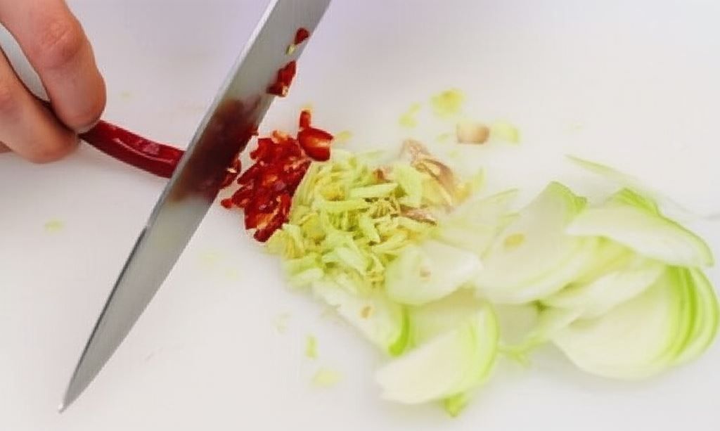 Cebulę posiekaj, trawę cytrynową pokrój bardzo drobno, poszatkuj chili i rozgnieć czosnek.
