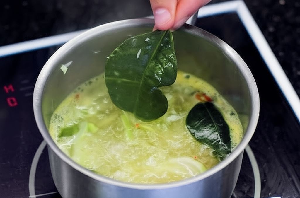 Wrzuć do bulionu cebulę, trawę cytrynową, listki i sok z limonki, czosnek oraz chilli. Gotuj przez 20 minut.