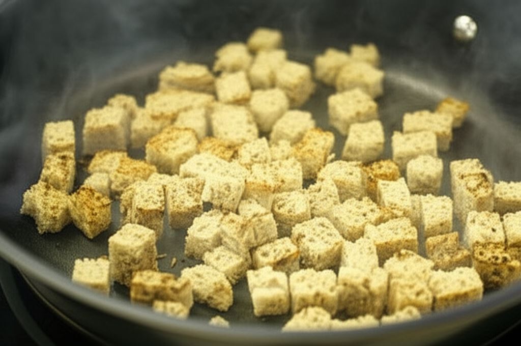 Chleb pokrój w kosteczki i zrumień na suchej patelni. Gotową zupę posyp grzankami.