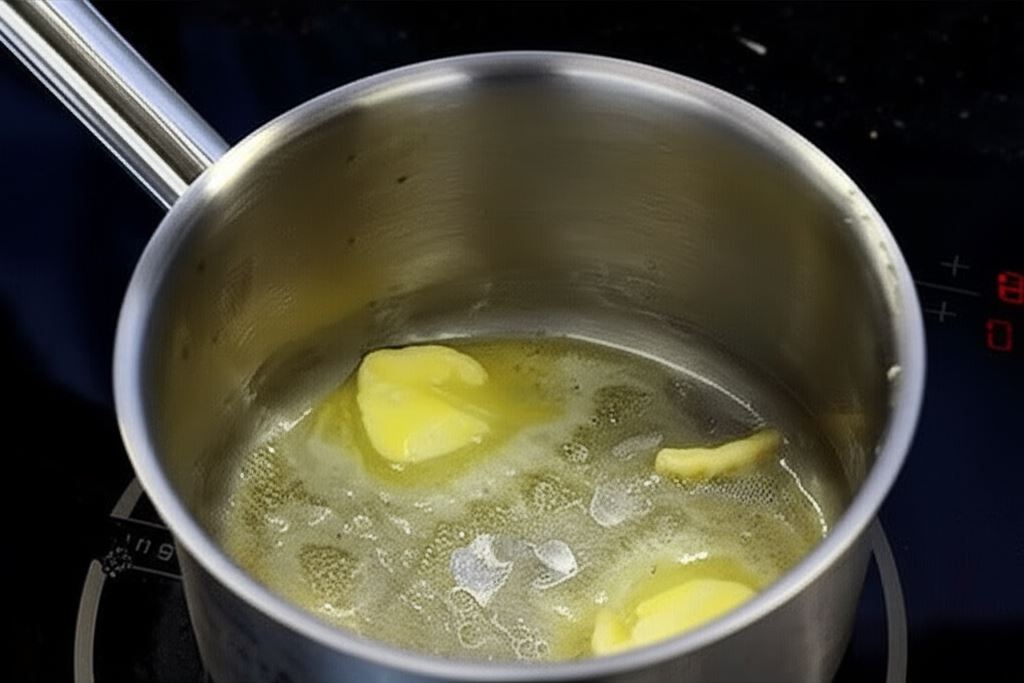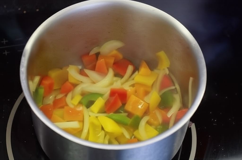 Potnij papryki w kostkę o wymiarze 2 centymetrów, potem posiekaj drobno cebulę. Zachowaj kilka kawałków papryki do dekoracji. Pozostałą część, razem z cebulą, zeszklij na maśle. Trzeba pilnować, aby masło nie przypaliło się, w przeciwnym razie potrawa będzie niesmaczna i szkodliwa dla zdrowia.