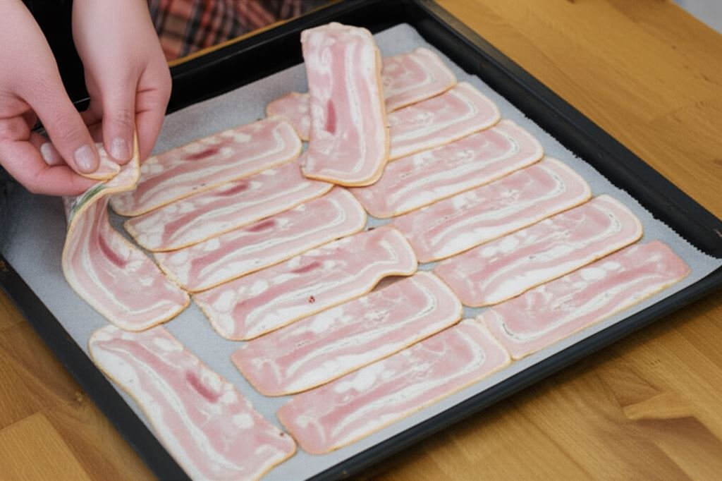 Kawałki boczku umieść na pergaminie na blasze do pieczenia i zapiekaj w piekarniku w temperaturze 180*C około 10 min. Potem przenieś na papierowy ręcznik, by usunąć nadmiar tłuszczu. Potnij w paski.