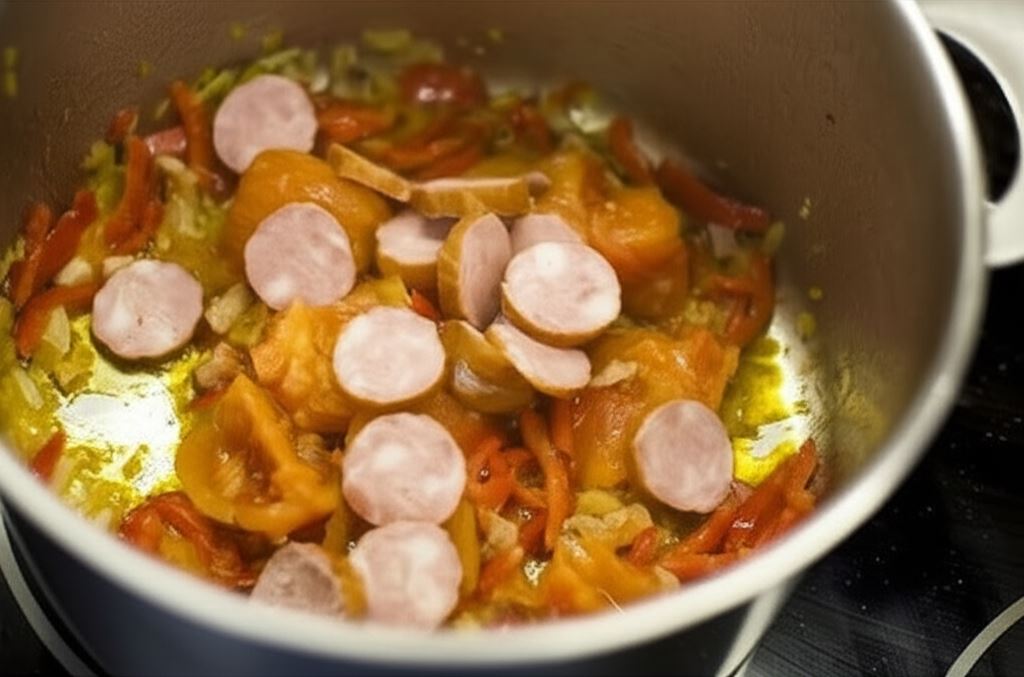 Kiedy wszystko się podsmaży, dodaj kiełbasę pokrojoną w plasterki.