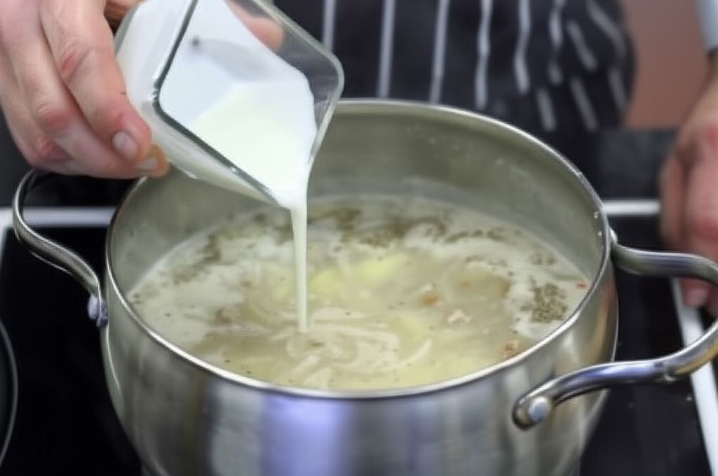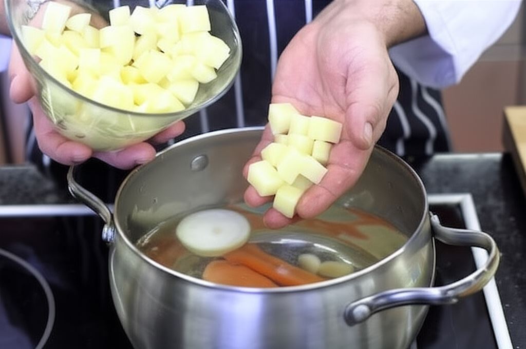 Gotuj bulion na włoszczyźnie wraz z ziemniakami pokrojonymi w kostkę i liściem laurowym, dopóki ziemniaki nie będą miękkie. Potem wyjmij włoszczyznę.