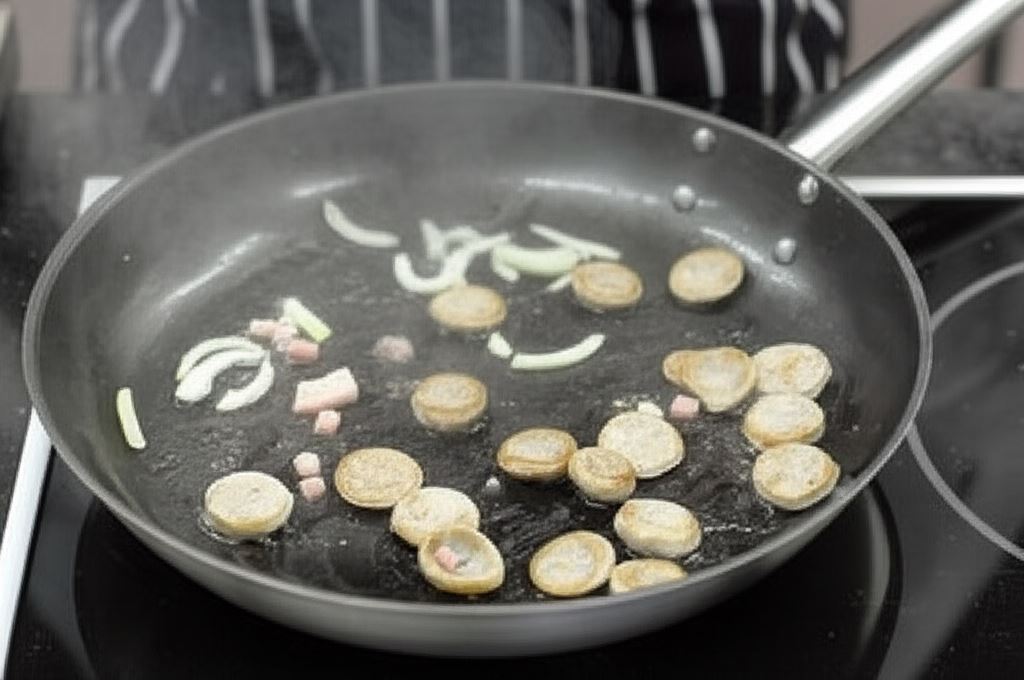 Na rozgrzanej patelni podsmażaj posiekaną w piórka cebulę razem z pokrojoną w plastry kiełbasą i pokrojonym w kostkę boczkiem. Potem wsyp wszystko do żurku.