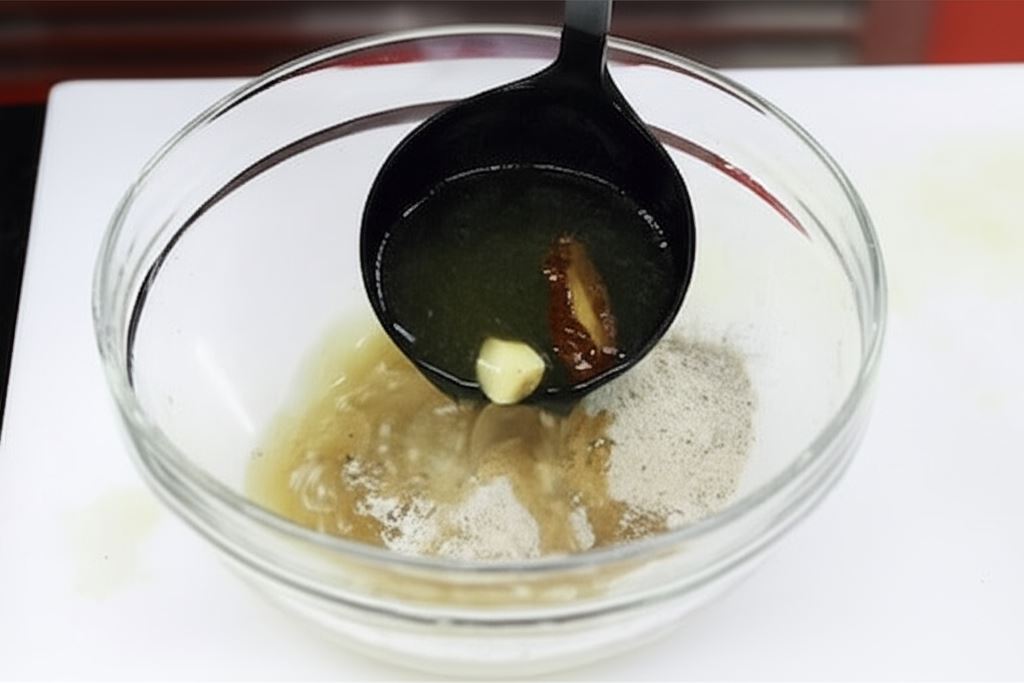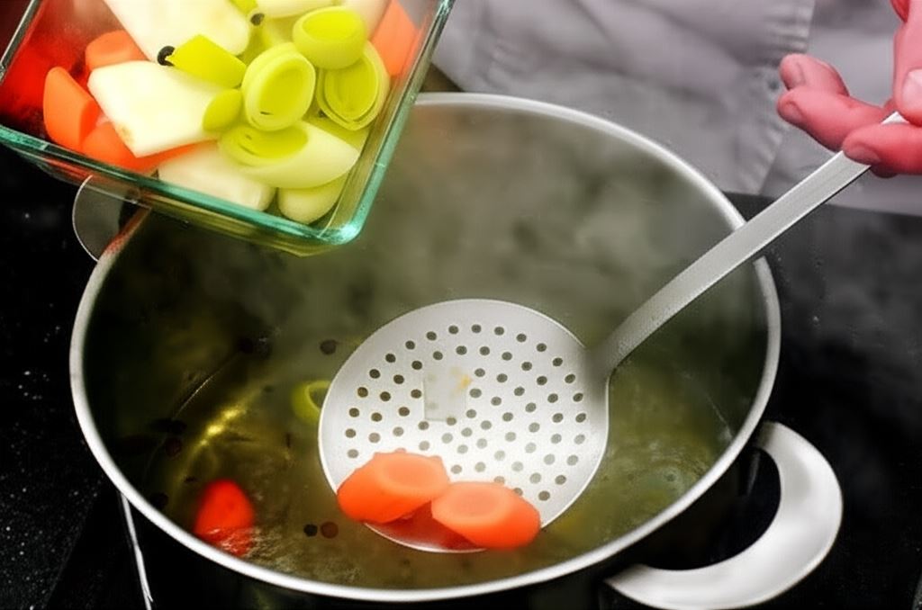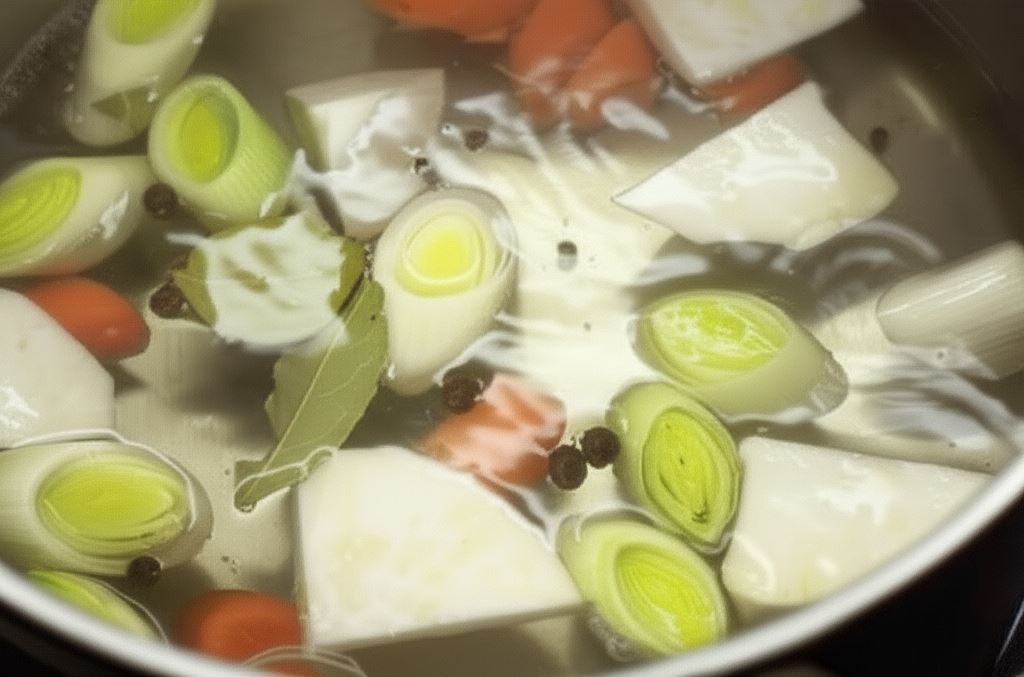 Oddziel utworzoną pianę i wsyp przyprawy (ziele angielskie, liść laurowy, pieprz, suszone grzyby, kminek, ząbki czosnku). Wywar gotuj powoli około godziny. Potem wyjmij warzywa.