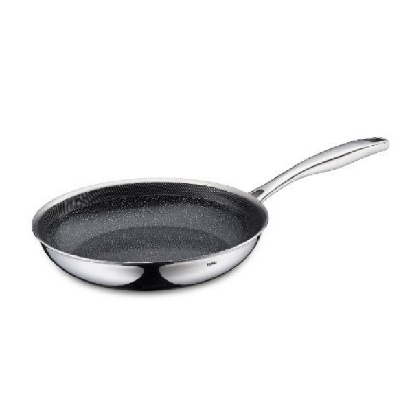 Patelnia tradycyjna KELA Flavoria 24 cm, powłoka strukturalna — do smażenia wyróżnia się połączeniem lekkiego aluminium i wykończenia ze stali nierdzewnej 18/10, co zapewnia zarówno dobrą przewodność cieplną, jak i estetyczne wykończenie. Strukturalna powłoka nieprzywieralna została zaprojektowana tak, by minimalizować przywieranie potraw i ułatwiać smażenie przy mniejszej ilości tłuszczu. Brak PFAS i PTFE w warstwie roboczej zwiększa bezpieczeństwo użytkowania. Odlewany uchwyt wykonany ze stali daje stabilność i pewny chwyt podczas pracy, a krawędź zapobiegająca kapaniu eliminuje zabrudzenia podczas nalewania sosów. Energooszczędne dno gwarantuje szybkie nagrzewanie i efektywność na wszystkich typach kuchenek, w tym indukcyjnych. Produkt jest przeznaczony do intensywnego użytkowania w warunkach domowych, zapewniając komfort, trwałość i oszczędność energii.Dodatkowe informacje