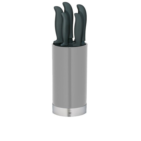 - 6 ножів у блоці: кухонний ніж, ніж для хліба, універсальний ніж, ніж для чищення, ніж для томатів, ніж для нарізки; блок уніфікованого дизайну в сірому корпусі з чорними вставками.