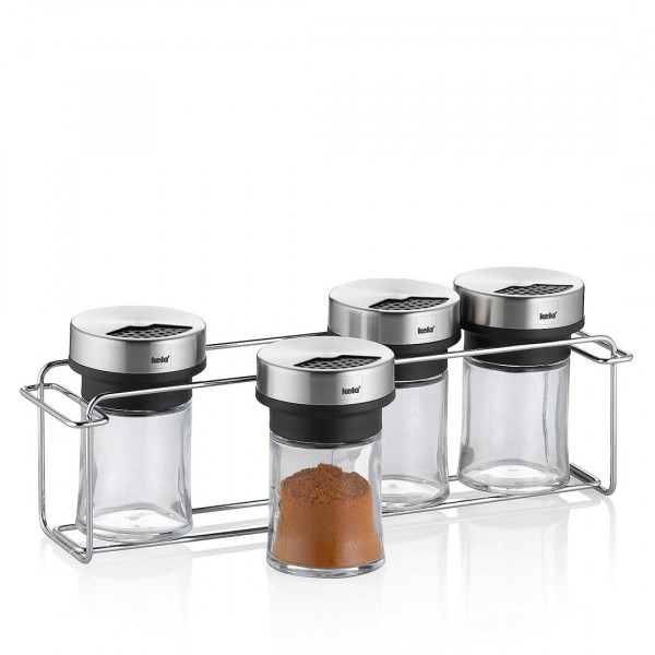 Przyprawniki KELA Miko 4 szt. ze stojakiem 5 el. stal - zestaw do kuchni to elegancki i funkcjonalny komplet przeznaczony do przechowywania i wygodnego dozowania przypraw w kuchni. Zestaw ułatwia organizację, zapewnia porządek na blacie oraz estetyczny wygląd dzięki połączeniu szkła i stali nierdzewnej. Produkt sprawdzi się zarówno w codziennym gotowaniu, jak i podczas serwowania potraw gościom, umożliwiając szybki dostęp do ulubionych przypraw.
